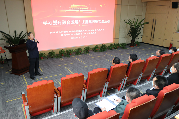 为深入学习贯彻党的二十届二中全会精神,以党的政治建设为统领,着力推进“三抓三促”行动走深走实,巩固并深化校(院)机构改革成果,促进部门之间深度融合,强化职能部门服务保障校(院)中心工作的能力,3月10日下午,党的建设和领导科学教研部党支部、图书和文化馆党支部、计划财务处党支部、保卫处党支部联合开展了以“学习 提升 融合 发展”为主题的主题党日暨党课活动,副校(院)长辛焕新以普通党员身份参加活动,副校(院)长袁凯应邀出席并指导。