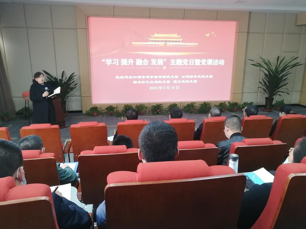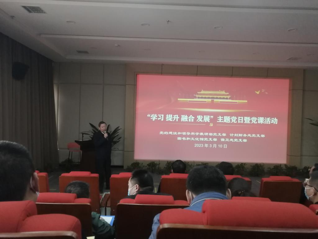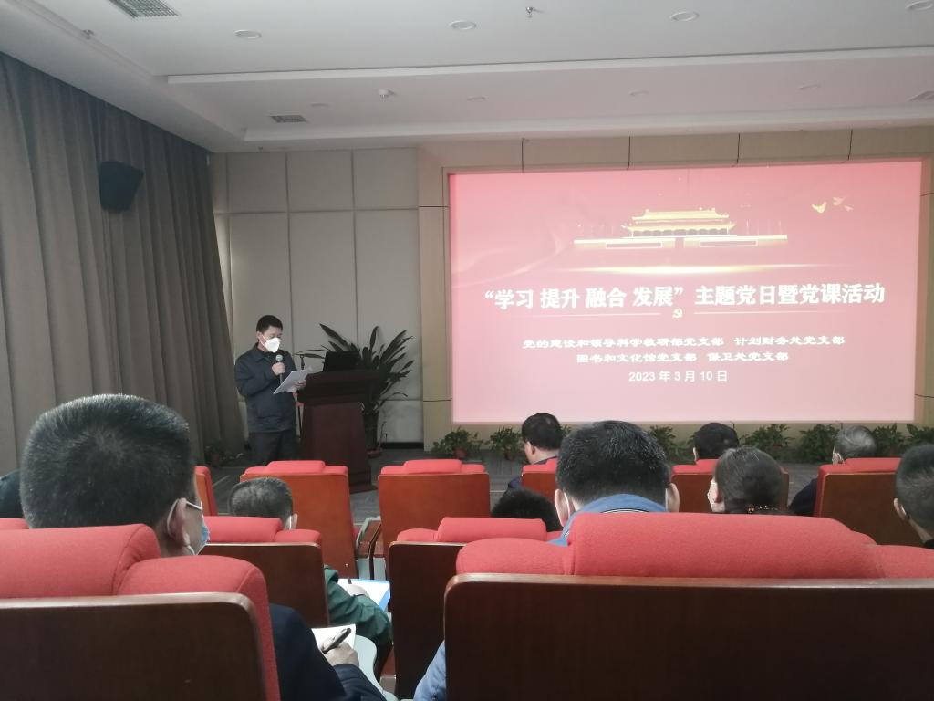 (通讯员 王鹏飞)为深入学习贯彻党的二十届二中全会精神,以党的政治建设为统领,着力推进“三抓三促”行动走深走实,巩固并深化校(院)机构改革成果,促进部门之间深度融合,强化职能部门服务保障校(院)中心工作的能力,3月10日下午,党的建设和领导科学教研部党支部、图书和文化馆党支部、计划财务处党支部、保卫处党支部联合开展了以“学习 提升 融合 发展”为主题的主题党日暨党课活动,副校(院)长辛焕新以普通党员身份参加活动,副校(院)长袁凯应邀出席并指导。活动由计划财务处党支部书记魏和平主持。
