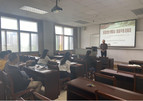 怀着对革命先烈的崇敬之心,张道坤副教授以兰州战役纪念馆现场教学的方式为大家讲述了一场生动严肃的党课,整堂党课围绕“忆英烈居安思危,高唱国歌”、“敬英烈饮水思源,献花篮三鞠躬”、“慰英灵鼓足干劲,重温入党誓词”、“赓续精神血脉,瞻仰精神丰碑”四个模块进行了讲解。