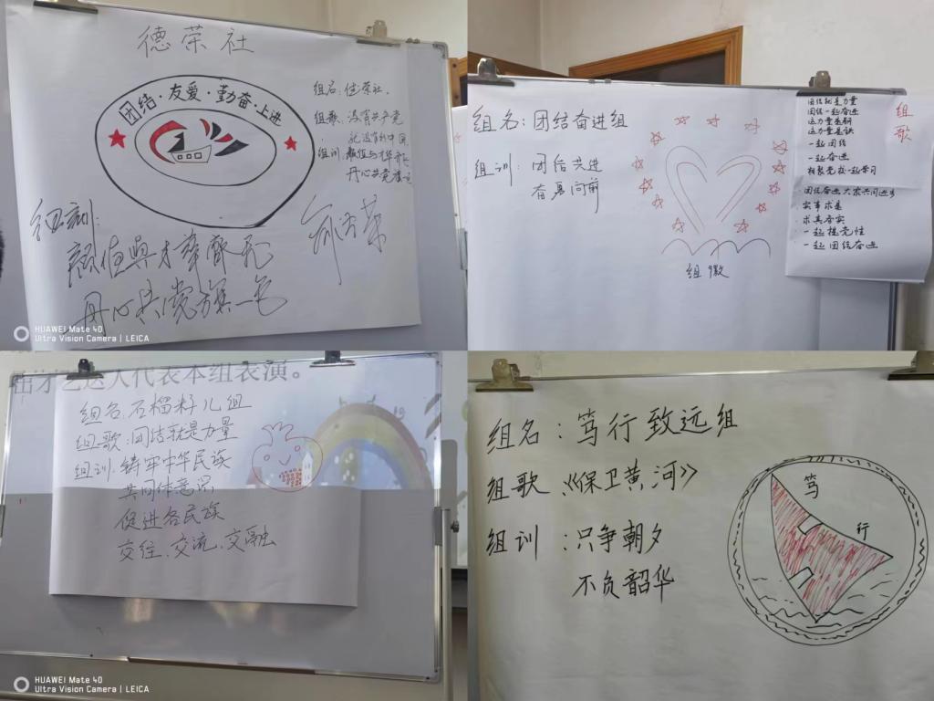 此次破冰训练活动共设置“团队组建”、“出镜亮相”、“荣誉归属”三个环节。在“战队组建”环节,52名学员随机分成4组,共同商议设计出可以彰显各组特色的队名、队徽、口号和队歌,并依次进行展示;随后各小组分别“出镜亮相”,由小组发言人向班级同学介绍本组成员信息和团队建设情况,并在主持人的引导下复述其他团队的特色亮点,在大家热烈的交流介绍中迅速加深了对彼此的了解;在最后的“荣誉归属”环节,大家根据各组展示情况,分别推举出了最佳组名、队徽、口号和队歌荣誉称号,并通过游戏的方式邀请各组学员进行才艺展示,学员们纷纷展示出拿手绝活,有歌曲独唱、武术表演等,整个教室充满着欢声笑语。