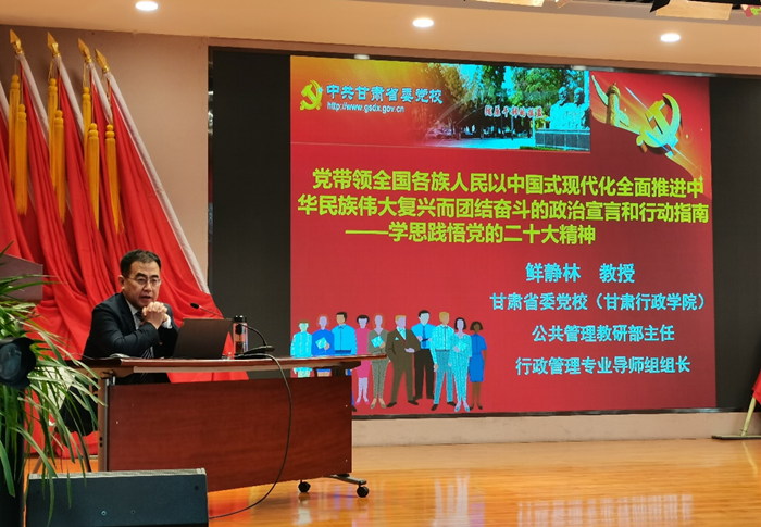 鲜静林教授围绕“党的二十大的基本情况和主要成果、重大意义及特点”、“党的二十大精神的主要内容和丰富内涵”、“学思践悟党的二十大精神”三个方面的内容,对党的二十大精神进行了全新解读。鲜静林教授强调,学思践悟党的二十大精神是当前和今后一个时期的首要政治任务,务必高度重视,要将思想和行动统一到党的二十大精神上来,坚定捍卫“两个确立”,坚决做到“两个维护”,要在“五个牢牢把握”和“三个全面(全面学习、全面把握、全面落实)”上下功夫,在理论联系实际、学思用贯通、知信行合一上下功夫。