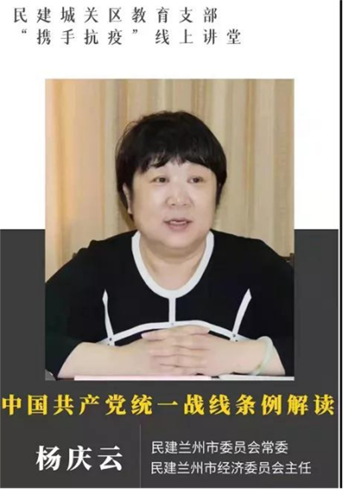 中共甘肃省委党校(甘肃行政学院)公共管理教研部教授,2020级行政管理1班班主任,民建兰州市委常委、经济委员会主任杨庆云在疫情防控中,充分发挥民主党派参政、议政职能作用,为抗疫工作积极建言献策。先后向兰州市委、市政府和省委党校(甘肃行政学院)提出《关于进一步改善和提升疫情防控工作能力的建议》、《关于兰州市严格开展疫情防控工作的建议》、《关于加强和改进志愿者服务工作的建议》等智库建言。杨老师充分发挥自身专业特长,积极参加民建兰州市城关区教育支部组织的“携手抗疫”线上公益讲堂,并发动全班学员到疫情防控一线,用实际行动为抗疫工作贡献自己的力量。