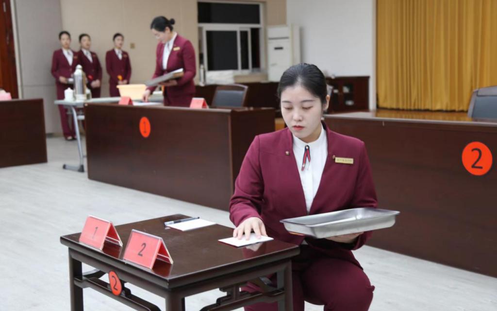 本次大赛分为客房服务和会场服务两个项目,每个项目均有6名选手进入决赛,参赛选手分别来自于培训服务一科和培训服务二科。比赛从仪容仪表、岗位实操和专业知识三个方面展开激烈的角逐。赛场上,每个选手都沉着冷静、自信从容,她们赛技巧,拼技能,认真答题,充分展示了精湛的专业知识理论水平和实际业务工作的操作能力。此外,大家在比赛期间也通过现场视频讲解和情景模拟的方式了解了洗衣房和总台的日常工作流程。