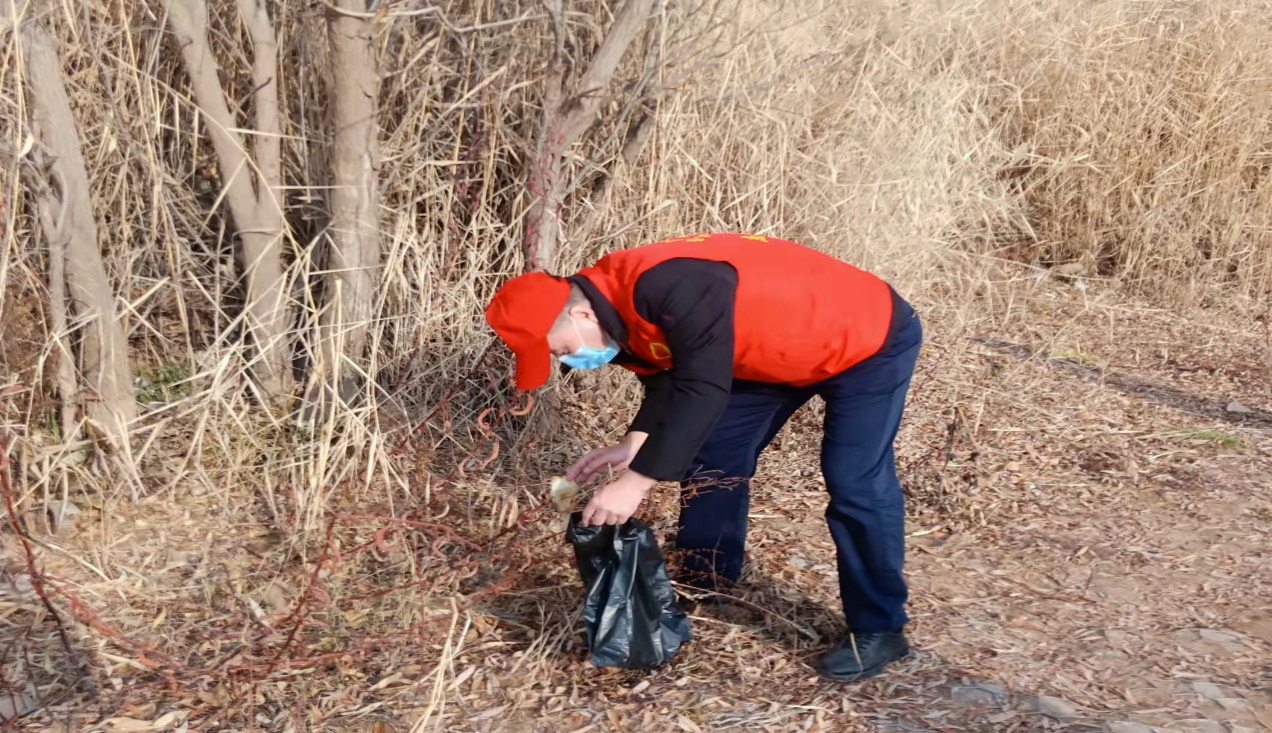 第四党支部志愿者身穿红马甲,沐浴阳光,迎着寒风,投身到黄河边垃圾清理的行动中来,一路清捡岸边的纸屑、饮料瓶、食品包装纸、烟头等垃圾,特别是对一些隐藏在草丛中的垃圾,志愿者们进行了细致的清理。
