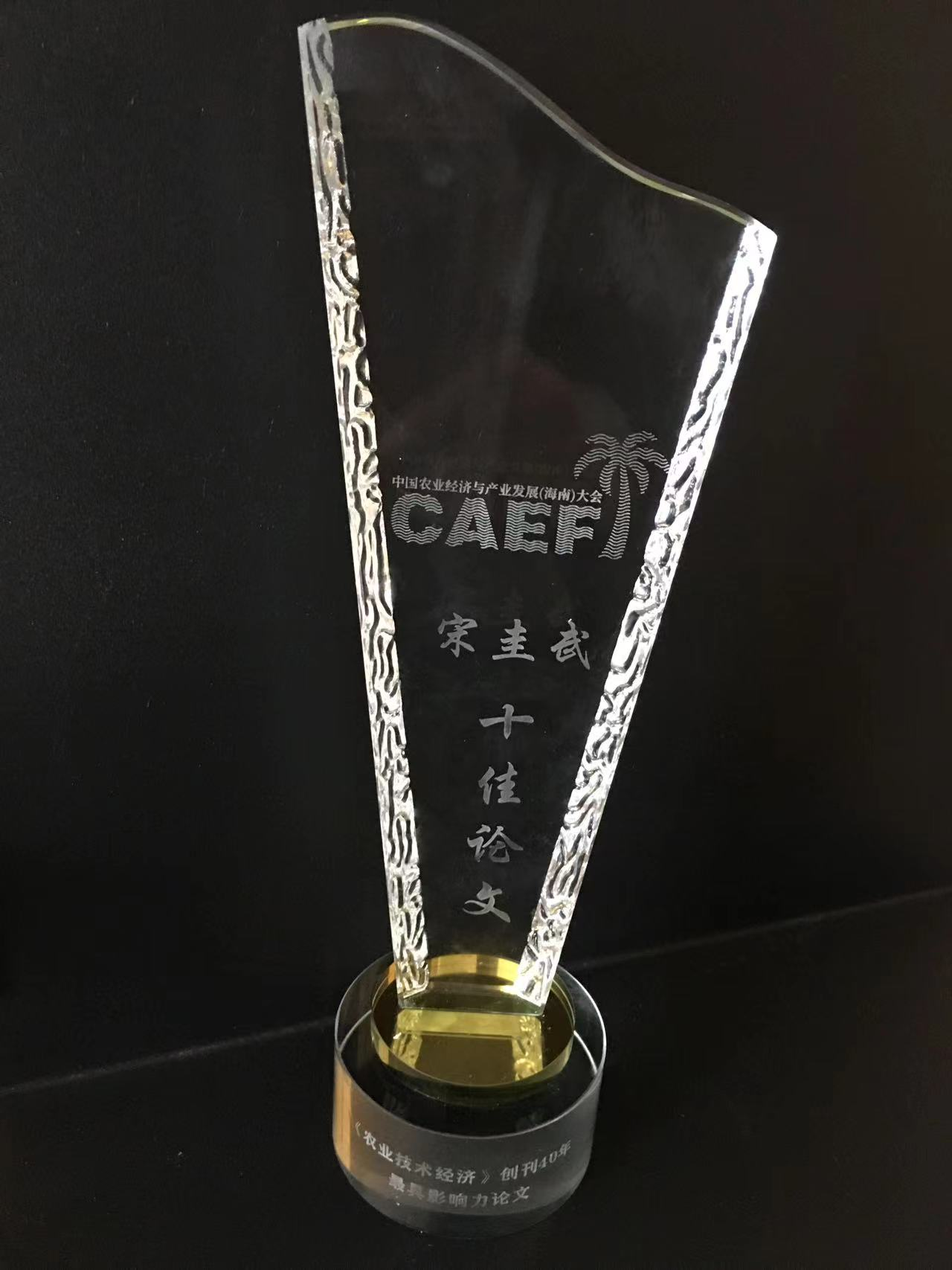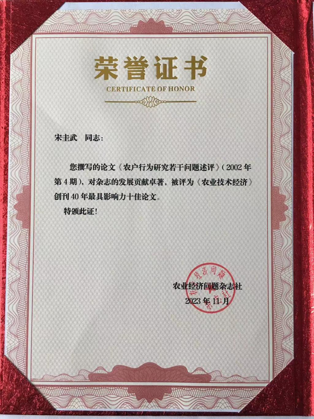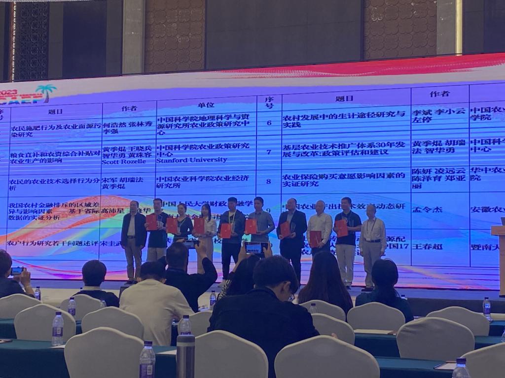 本次大会还举办了《农业技术经济》创刊40年最具影响力十佳论文等奖项的颁奖仪式。根据被引率指标排名,宋圭武教授撰写的论文《农户行为研究若干问题述评》(《农业技术经济》2002年第4期)获《农业技术经济》创刊40年最具影响力十佳论文奖。