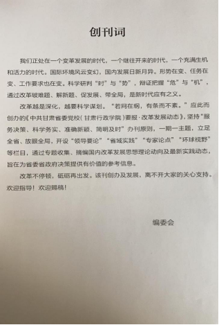 (通讯员 李文涛)为进一步拓展智库成果展示平台、积极发挥校(院)决策咨询职能作用,在校(院)委领导下,在校(院)主要领导悉心指导下,《中共甘肃省委党校(甘肃行政学院)要报·改革发展动态》于2021年11月7日正式创刊发行。