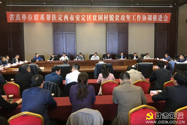 会上,安定区委书记赵众炜汇报了安定区脱贫攻坚工作总体情况,省委党校、《党的建设》杂志社、甘肃行政学院、省冶金有色工业协会、省自然能源研究所、省储备物资管理局分别汇报了2017年脱贫攻坚帮扶工作开展情况和2018年脱贫攻坚帮扶工作打算。