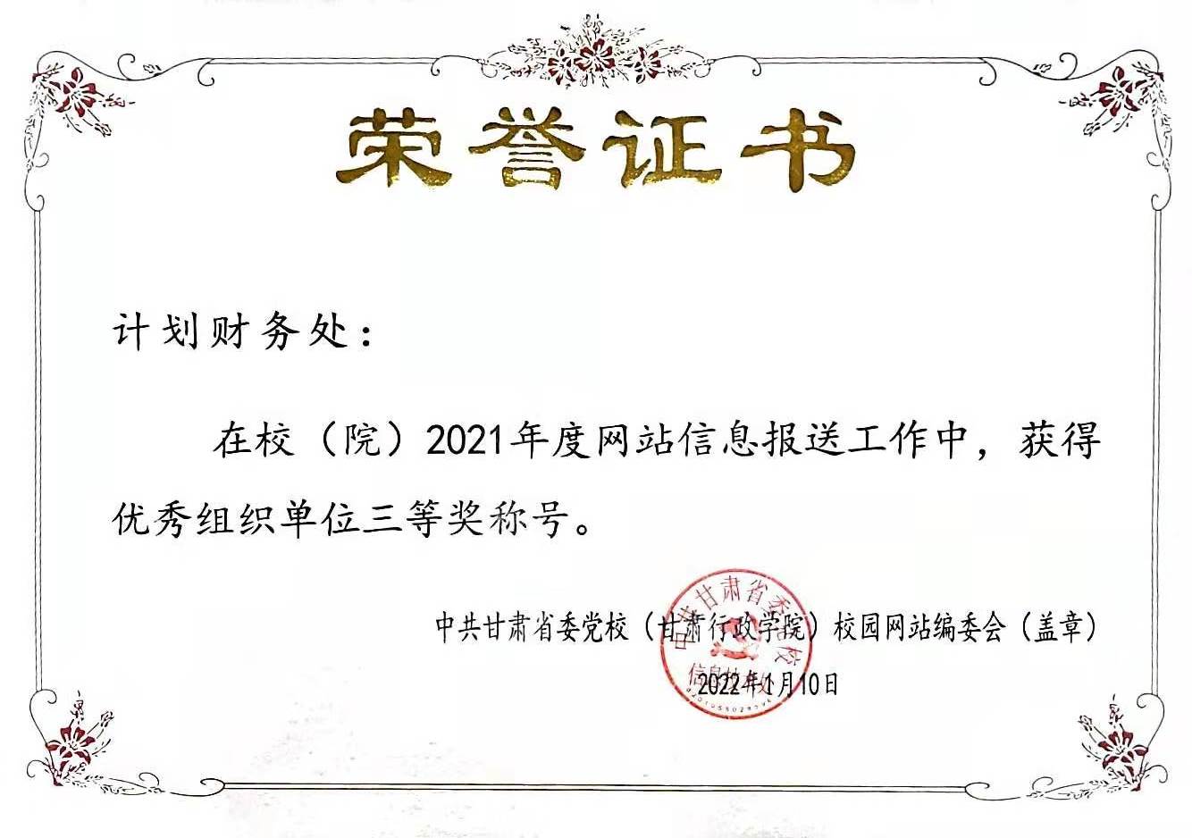 (通讯员 何玉婷)依据《中共甘肃省委党校(甘肃行政学院)新媒体平台信息管理办法》,日前,校(院)决定对2021年度新媒体平台信息报送优秀组织单位进行表彰,计划财务处被评为优秀组织单位三等奖。这是自2019以来,我处连续两年获此殊荣。