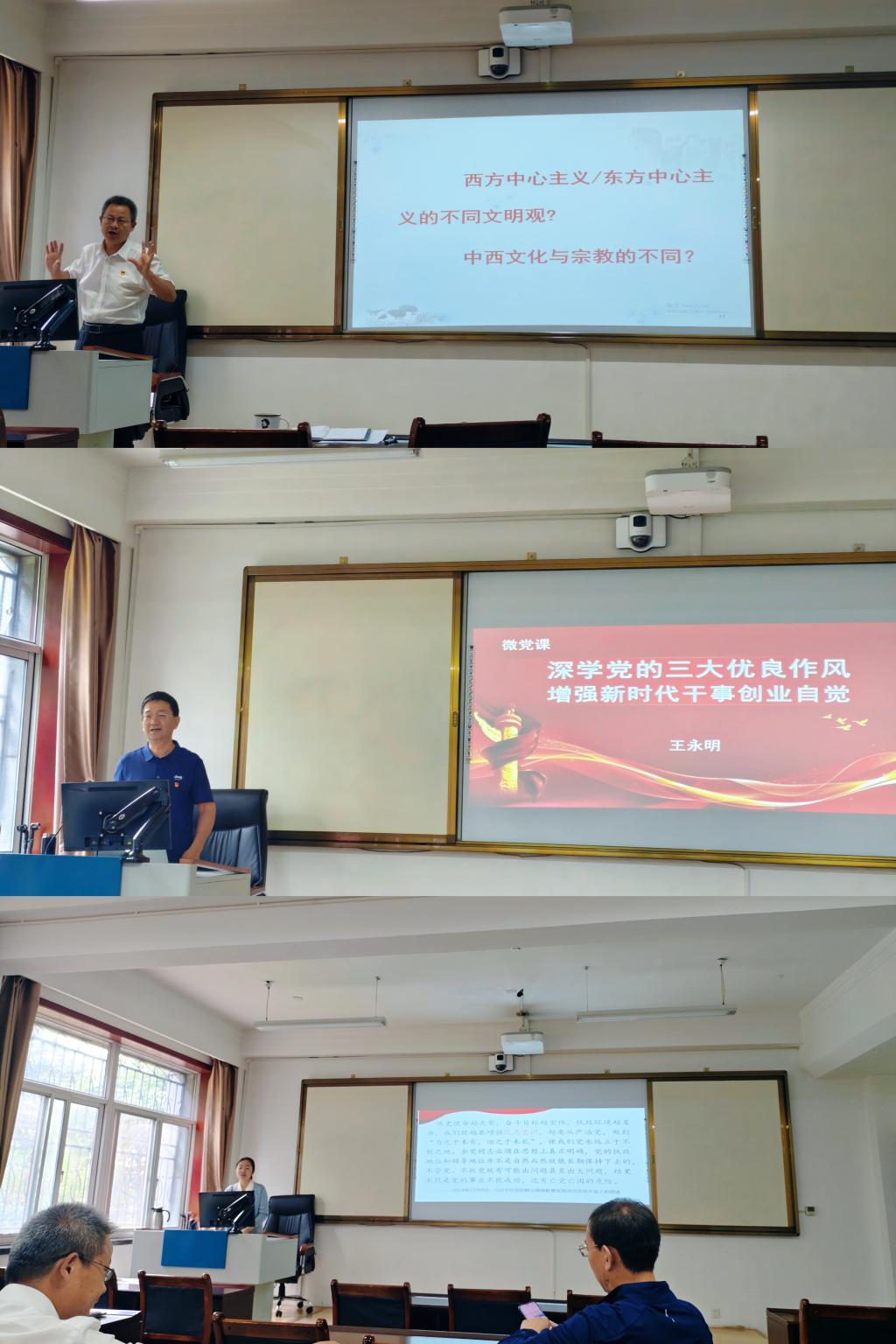 一是王永明、刘燕平、马婷三位党员老师讲微党课。他们分别以《深学党的三大优良作风 增强新时代干事创业自觉》《中央八项规定精神学习教育的必要性》《坚定共产党人的理想信念》为题,紧扣“深入贯彻中央八项规定精神学习教育”主题,内容设置科学,教育意义深刻,既锤炼了党性、提高了思想觉悟,又凝聚起了干事创业强大动力。