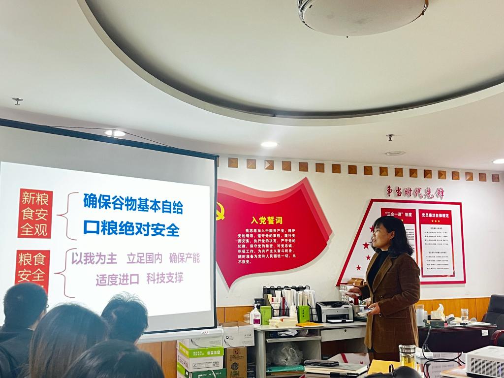 首先,滕海峰领读学习《习近平新时代中国特色主义思想专题摘编》中的“全面推进乡村振兴,加快建设农业强国,推进农业农村现代化”和《习近平著作选读第一卷》中的“确保我国粮食安全”等重点内容。其次,姚庆荣结合自身相关研究,围绕“保障国家粮食安全:困境与出路”作了专题辅导,重点从三个方面讲授了保障粮食安全的极端重要性:一是准确把握粮食安全的概念和内涵;二是保障粮食安全是维护最基本人权的第一要务;三是从国际国内方面阐述国家粮食安全的重要性。最后,与会老师进行了交流研讨,并一致认为专题辅导逻辑合理,讲解透彻,具有很强的现实意义和指导意义,大家在学习交流探讨中受益匪浅。