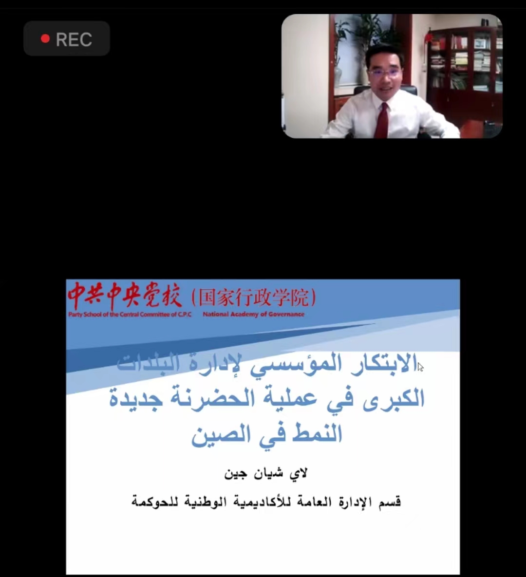 中央党校(国家行政学院)公共管理教研部主任王满传和阿尔及利亚内政部人力资源、培训和法规事务总司长梅拉波提分别在线致辞并主持会议。