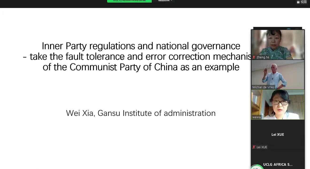 2022年4月,校(院)收到国际行政院校联合会(IASIA)关于2022年摩洛哥年会征文的通知后,共有3名教授提交了论文,党内法规研究中心卫霞教授题为《国家治理与党内法规》的论文成功入选。7月26日在第七研讨组“公共政策、决策和政策实施”的分会场交流研讨中,卫霞教授做了英文主题发言。她阐释了中国国家治理与党内法规的关系,分享了关于党内法规中公务员问责规范化必然趋势的观点,探讨了国家治理中公务员在改革探索中,不因主观过错造成的否定性后果如何认定的法律程序设计,并从研究趋势、研究方法、制度探索等方面进行了分析探讨,引起了与会专家的关注和讨论。卫霞教授以专业严谨的态度传播立场观点,为促进全球公共治理建言献策,在IASIA这一重要国际学术交流活动中,展现了校(院)教师的良好形象。