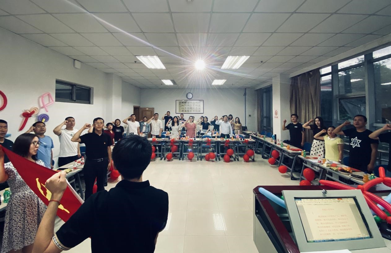 歌声阵阵催人奋进,誓言铮铮阔步前行。“我志愿加入中国共产党,拥护党的纲领……”活动在重温入党誓词中拉开帷幕。教室里,全体师生高举右拳,面对党旗重温了入党誓词。