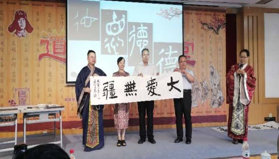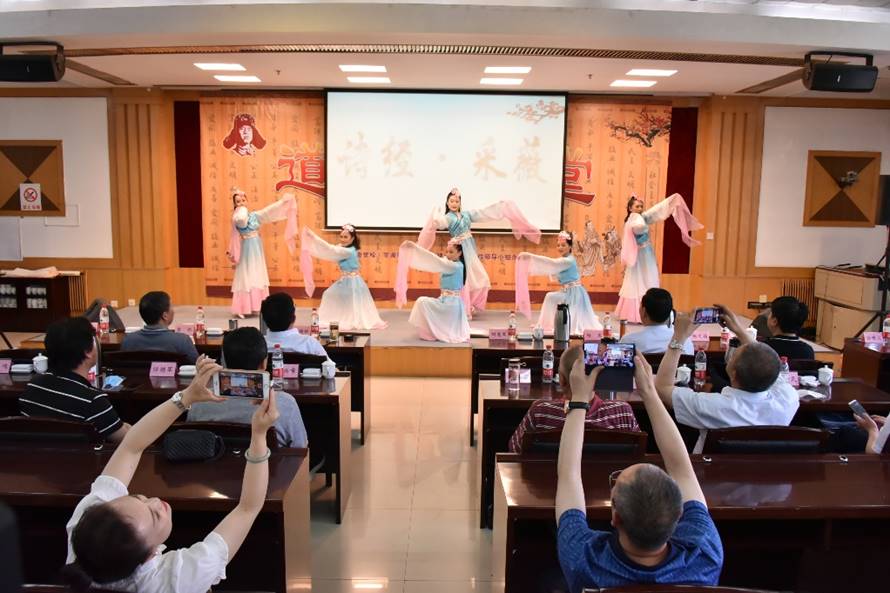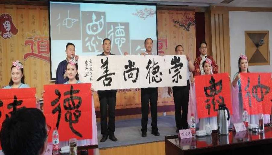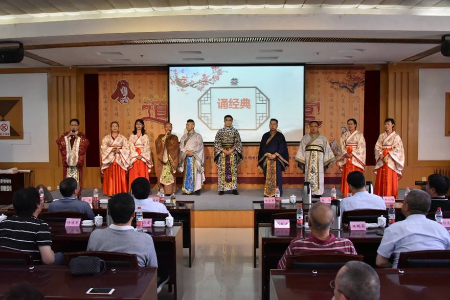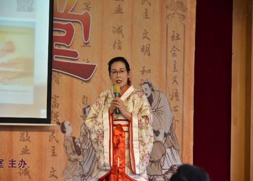 此次道德讲堂由主会场和分会场组成,开创校(院)道德讲堂的新形式。主会场由文史教研部全体教师身着汉服在202教室演出,分会场由文史教研部请到的国内和省内知名书画名家及校(院)书协成员在教学楼一楼大厅开展。