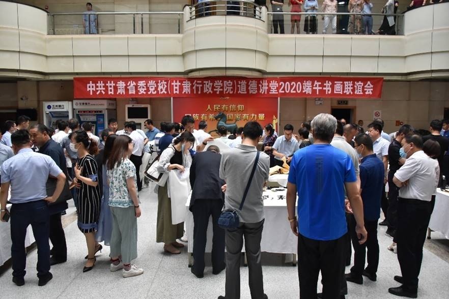 道德讲堂第二现场为“中共甘肃省委党校(甘肃行政学员)道德讲堂暨2020端午书画联谊会”,会场设在教学楼一楼大厅。文史教研部邀请了省上著名书画家:中国著名山水画家、中国美术家协会会员、中国楹联学会会员孙元吉先生,中国书法家协会会员、甘肃省书法家协会理事,省直机关工委书画院执行院长曹兴章先生,中国书法家协会会员、民盟甘肃书画院副院长、甘肃省青年书协副主席任继军先生,兰州市书法家协会副主席、西固区书协名誉主席姚鹏英老先生,中国美术家协会会员、甘肃省歌舞剧院书画室专职画家,民盟甘肃书画院理事,甘肃省青年美术家协会理事马鸣先生,中国书法家协会会员、中国楹联协会会员赵望来老师,甘肃省书法家协会会员赵仕民先生等现场为参加道德讲堂的校(院)领导、老师和学员赠送书法绘画作品,现场气氛热烈,作品“供不应求”,得到在场书法爱好者的一致好评,又为校(院)道德讲堂平添了一道靓丽的风采。