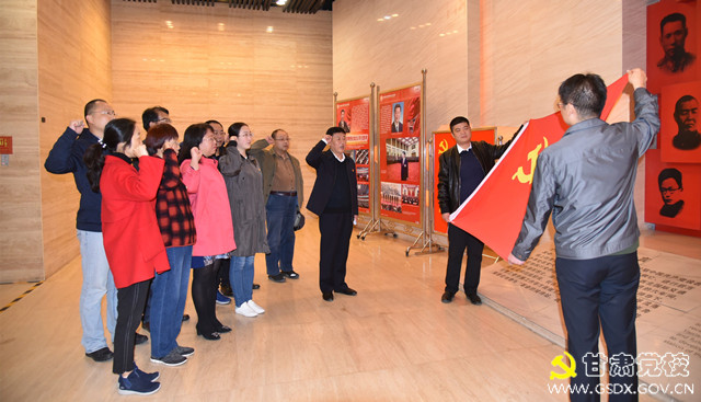 全体党员面向党旗庄严宣誓,重温入党誓词。随后同志们走进展厅,仔细参观展览,认真倾听讲解员讲解。展厅中包含“建立统一战线”“进行思想发动”“实施西北开发”“奔赴抗日前线”等展览内容,一幅幅图片、一件件实物,把大家带回到革命时期的难忘岁月。八路军兰州办事处成立于1937年8月25日,是抗日战争时期中国共产党设在兰州的公开办事机构,是领导甘肃抗日救亡、进行后方发动、实现全民族抗战的重要基地。办事处在谢觉哉、伍修权的领导下,广泛宣传中国共产党的抗日主张,积极组织和推动甘肃抗日救亡运动,培养输送大批进步青年到延安参加革命,为抗日战争的胜利做出了重要贡献,被周恩来亲切地誉为“革命的接待站,战斗的指挥所”。革命先辈们为了坚定的共产主义理想而艰苦奋斗的伟大精神,使大家心灵受到了震撼和洗礼。通过参观,重温党的历史,使我们深刻认识到今天的生活来之不易,同时也更加坚定了“牢记使命 不忘初心”的理想信念,增强了作为一名共产党员的使命感和责任感。