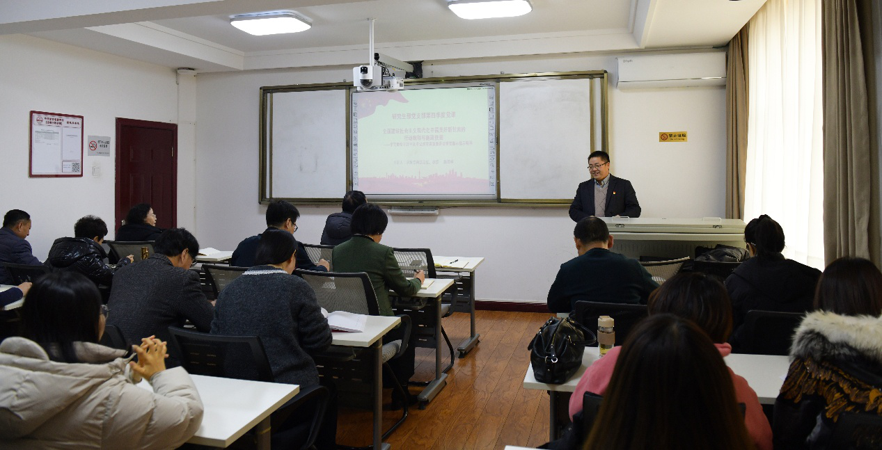 12月25日上午,研究生部党支部和决策咨询部党支部共同组织召开了第四季度专题党课暨“党建领航,咨研共进”共建活动。决策咨询部主任滕海峰教授以“全面建设社会主义现代化幸福美好新甘肃的行动纲领与施政依据”为主题,给研究生部和决策咨询党支部全体党员讲授党课。党课由研究生部党支部书记郭丽芳主持。