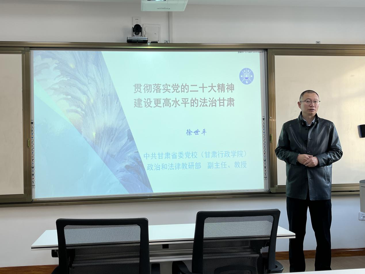 党性教育是党校教育的灵魂和核心,是坚持党校姓党原则的重要体现。为上好党性教育“第一课”,2023年3月6日,中共甘肃省委党校(甘肃行政学院)政治和法律教研部副主任徐世平教授,在新学期第一天对2021级法学理论专业(二)班研究生作了专题讲座,报告的主题是《贯彻落实二十大精神建设 更高水平的法治甘肃》。