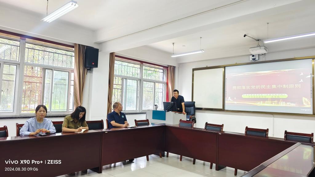 根据校(院)工作安排,中共党史教研部副主任范景鹏教授、朱彩萍教授分别承担《贯彻落实党的民主集中制原则》《严守党的政治纪律和政治规矩》两个新专题,两位教授利用暑假时间积极备课,并参加了在8月22日举行的秋季学期第一批次新专题说课教学活动,会后两位教授又根据评委专家意见进一步修改完善。面对教研部青黄不接的局面,为了让年轻教师提高教学水平,尽快成长起来,早日承担起主体班教学的主责主业。在30日上午举行的新学期开学后的第一个主题党日,两位教授就新专题开发为教研部年轻教师举行备课示范会,从思路、结构、逻辑、材料、设计等方面亲身示范讲解,年轻教师认真聆听,发扬学术民主,充分交流。范景鹏教授还就如何撰写党史学术论文的经验与年轻教师进行了分享交流。
