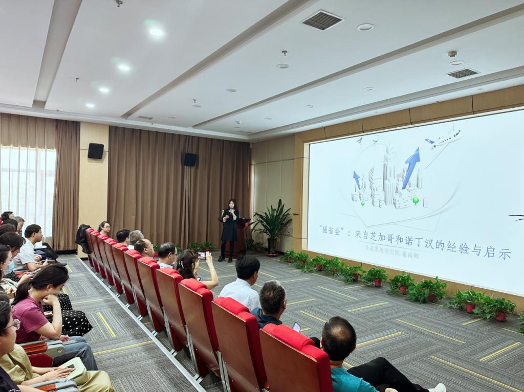 论坛中青年教师蒋尚卿基于“强省会”行动的目标指向,根据兰州市的城市发展特点和发展需要,从英国和美国各选择一个现代化进程完善、国内国际发展领先的代表性城市:美国芝加哥及英国诺丁汉,结合本人亲身考察和实地调研,与兰州市进行对标比照,从城市建设、经济发展、文化旅游等主要角度展开研究和剖析,为兰州市推进“强省会”行动、构建新发展格局提供经验借鉴和对策建议,降低试错成本,提升发展效率。学术报告内容新颖逻辑清晰语言流畅为老师们打开了新的视野和角度具有世界眼光和战略思维