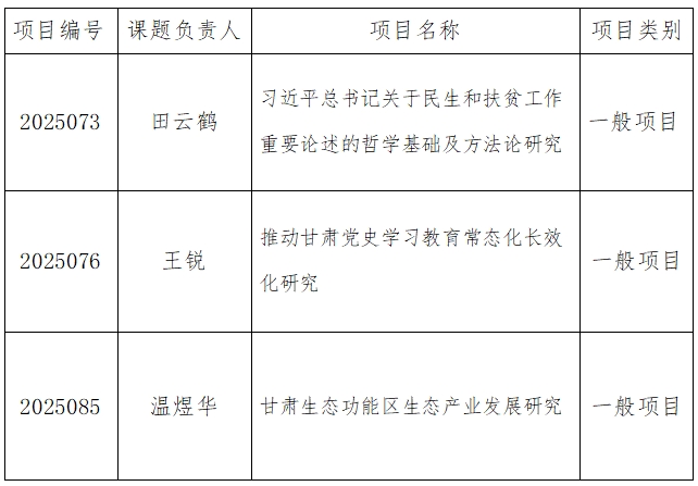 近日,甘肃省哲学社会科学规划办公室公布了2025年第四批省社科规划项目结项名单。校(院)3项课题顺利结项,分别是:
