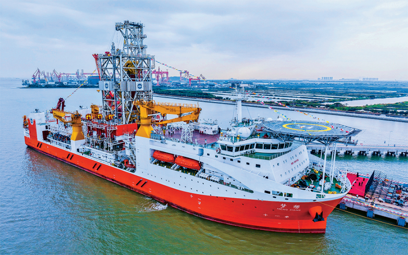 2024年11月17日,拥有最大11000米的钻深能力、我国自主设计建造的首艘大洋钻探船“梦想”号在广州正式入列,标志着我国深海探测关键技术装备取得重大突破。图为当日拍摄的靠泊在广州海洋地质调查局科考码头的大洋钻探船“梦想”号。 新华社记者 刘大伟/摄