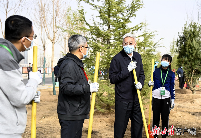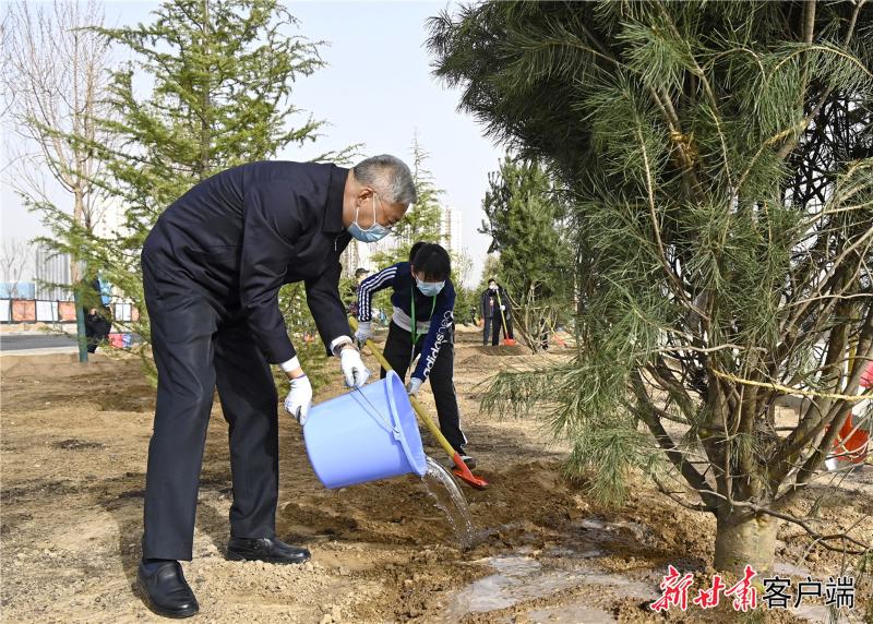 4月12日,省委书记、省人大常委会主任尹弘在兰州市与干部群众一同参加义务植树活动。新甘肃·甘肃日报记者 高 樯