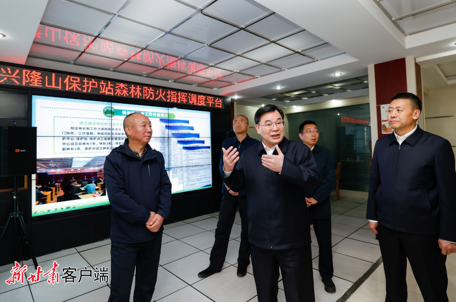 在兴隆山国家级自然保护区管护中心兴隆山保护站值班室,胡昌升通过视频监控系统察看护林防火、值班值守等情况,并深入林区检查林区管护和防火工作,对坚守一线的防火队员表示亲切问候。他指出,当前已进入冬季森林防火关键期,容不得丝毫麻痹大意和侥幸心理。全省各级各有关方面要牢固树立安全发展理念,始终保持高度警惕,时刻绷紧森林草原防灭火这根弦,严格加强林区管理,坚持以防为主、防灭结合,切实做到防未、防危、防违,高度重视人为因素引起火灾,立体施策防范和遏制森林火灾发生。
