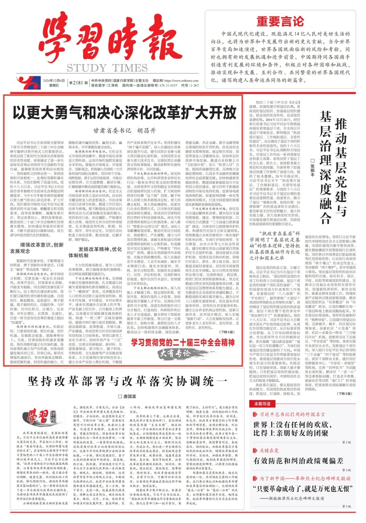 习近平总书记在省部级主要领导干部学习贯彻党的二十届三中全会精神专题研讨班开班式上的重要讲话,系统总结了新时代全面深化改革取得的历史性成就,深刻阐述了进一步全面深化改革必须坚持守正创新的丰富内涵,强调要坚持改革和法治相统一、坚持破和立的辩证统一、坚持改革和开放相统一、处理好部署和落实的关系,为我们指明了前进方向。党的十八大以来,习近平总书记3次亲临甘肃考察都对全面深化改革提出明确要求,今年9月考察甘肃时强调要以更大勇气和决心深化改革、扩大开放。我们要深学细悟习近平总书记重要讲话的丰富内涵、精髓要义和实践要求,高举改革旗帜、凝聚改革共识,坚定改革信心、勇担改革使命,推动党的二十届三中全会精神在甘肃落实落地,加快建设幸福美好新甘肃、不断开创富民兴陇新局面,奋力谱写中国式现代化甘肃篇章。