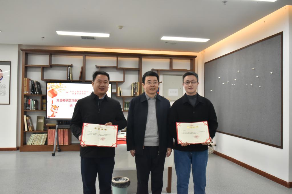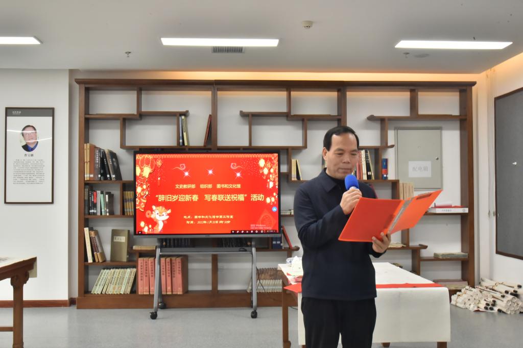 活动开始,首先由文史教研部两位青年书法家赵望来、任明向图书和文化馆捐赠党史教育书法作品。接着,副校(院)长杨忠致辞,他指出,写春联、贴春联,不仅是春节的一项重要活动,也是中国独有的一种文化习俗。无联不成春,有联春更浓。春联不仅承载了人们美好的希望和祝福,更代表了源远流长的节日传统文化。图书和文化馆联合文史教研部、组织部开展写春联、送祝福活动,这既是喜迎新春佳节、丰富校园文化生活、积极发挥文化功能的有益尝试,也是三个部门开展支部结对共建和主题党日活动的创新举措。希望广大教职工以后多多关心支持图书馆工作,充分利用和发挥好图书馆书画工作室的功能和作用,使之成为校园文化建设的一道靓丽风景。