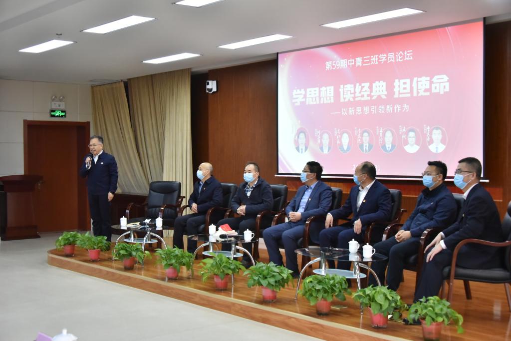 通讯员 单小东3月31日上午,校(院)59期中青年干部培训三班举行学员论坛围绕“学思想、读经典、担使命——以新思想引领新作为”开展研讨交流常务副校(院)长刘进军出席并讲话论坛由第59期中青年干部培训三班学员张梦涛同志主持校(院)办公室、教务处、文史教研部、培训部负责同志及李景铭教授、刘务勇教授、闫晓勇教授等教师代表参加。