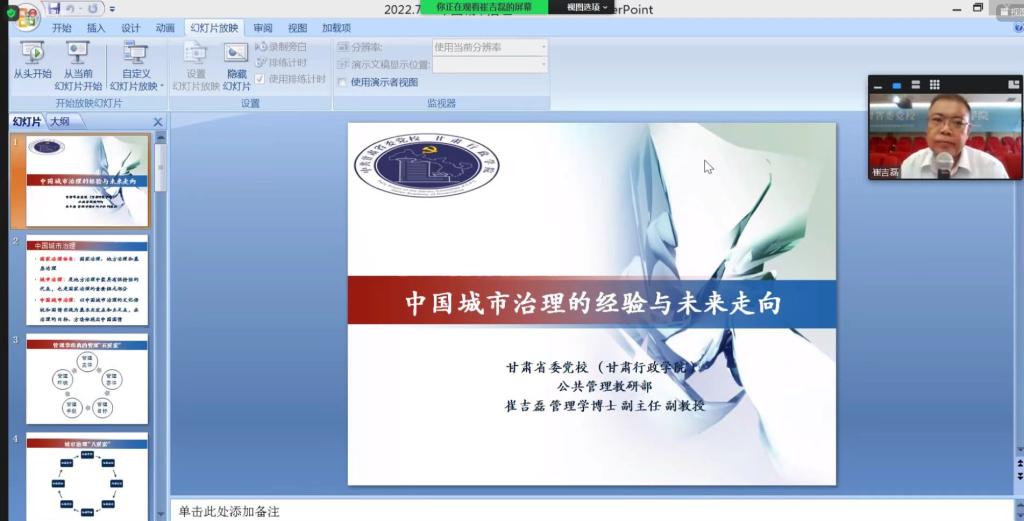 随后,专家们进行了专题发言。鲜静林教授以《提升治理效能,推动社会治理效能达到新水平》为题,阐释了治理效能的涵义,并从完善治理体系、构建治理格局;加强党的领导、提高治理四化水平;建设平安甘肃、加强和创新社会治理;加强基层社区治理体系建设、推动社会治理重心下移等四个方面论述了中国特色社会主义制度体系和治理体系的优势和治理效能。