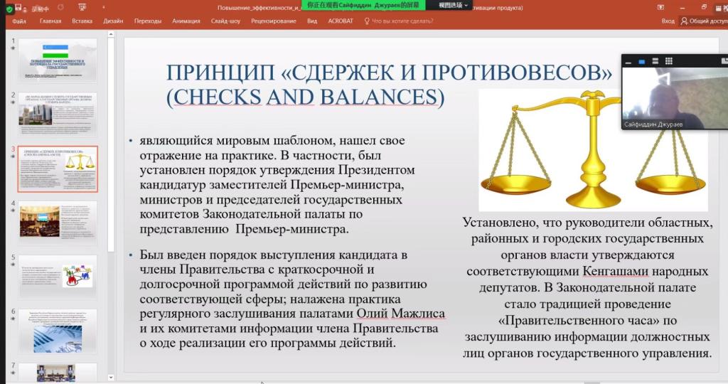 鲁斯塔姆·朱马耶夫副教授以《公共行政的现代概念》为题,列举和分析了乌兹别克斯坦新政府成立以来采取的一系列积极有效的管理措施,进一步阐述了国家机构为民服务的根本遵旨。