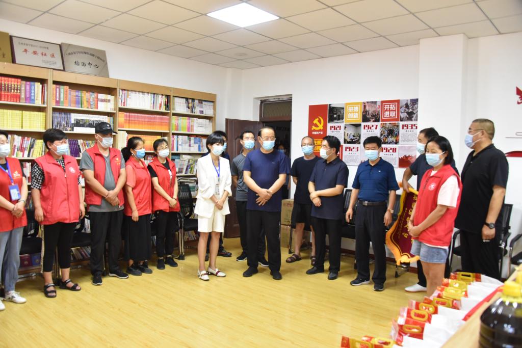 “大家防护用品够吗?”“大家是怎么轮班的?”“天气热,穿防护服的同志要小心中暑”。刘进军详细了解了社区一线防疫工作者的工作和生活情况,对社区党委班子在当前严峻的防疫形势中表现出的高度政治自觉和强烈责任担当精神给予了充分的肯定,对疫情期间社区工作者不分昼夜地冲在最前线,任劳任怨、无私奉献的辛勤付出表达敬意和感谢,并叮嘱大家一定要做好防护和防暑措施,继续保持昂扬的斗志,坚决做到防疫不松劲,进一步织密织牢疫情防控网。