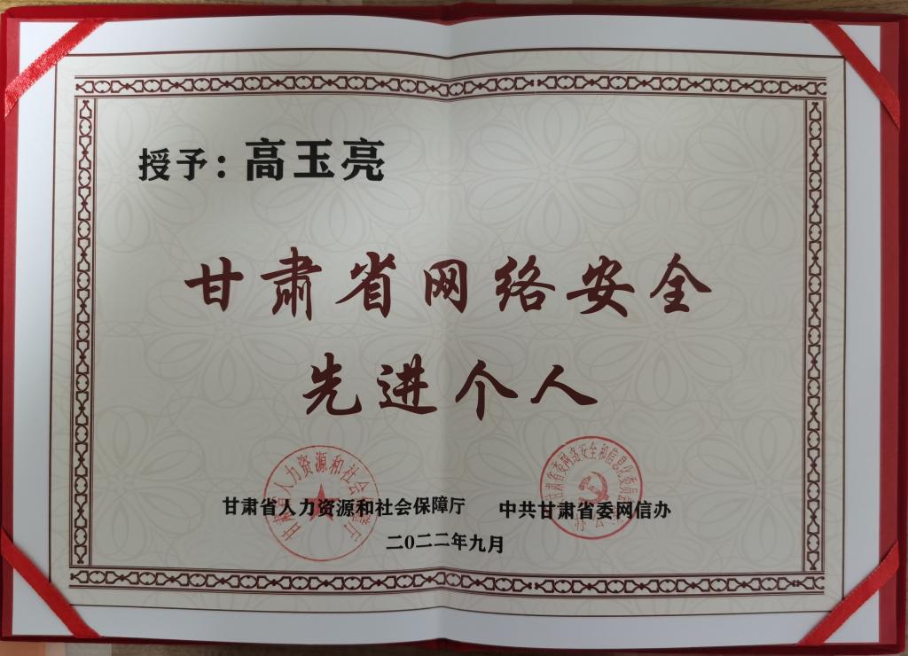(通讯员 宋玉玉)近日,2022年甘肃省网络安全宣传周开幕式在兰州举行,省人社厅、省委网信办授予全省15个集体“甘肃省网络安全先进集体”称号,授予全省30名同志“甘肃省网络安全先进个人”称号。我校(院)信息技术处网络管理科科长高玉亮同志荣获“甘肃省网络安全先进个人”称号。