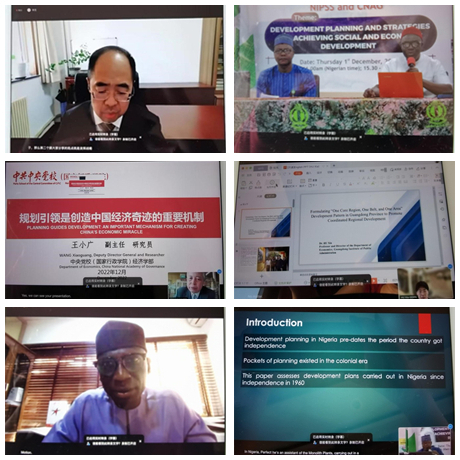中央党校(国家行政学院)经济学教研部副主任王小广、广东省委党校(广东行政学院)经济学教研部主任胡霞、尼国家政策与战略研究所高级研究员古式贝特、尼财政预算和国家计划部国家发展规划司副司长奥涅梅奇分别以规划引领是创造中国经济奇迹的重要机制”“广东构建一核一带一区区域发展格局促进区域协调发展”“尼日利亚国家规划发展历程:成功、不足与机遇”“2021-2025年尼日利亚国家发展规划:实现国家的复兴为题做主旨发言。