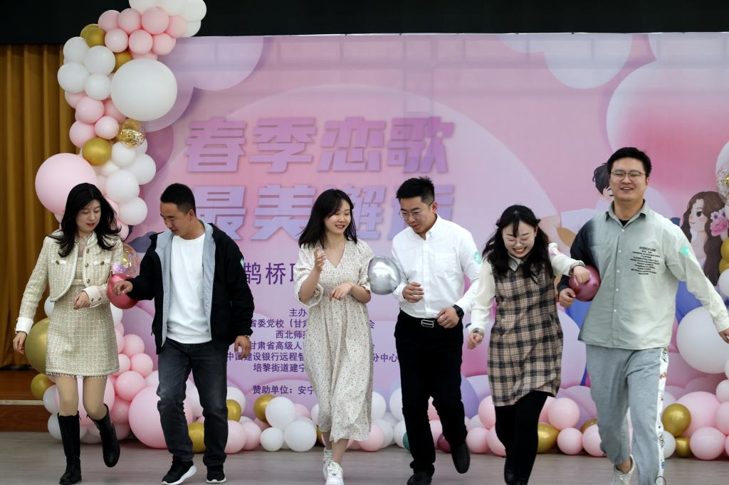 活动在西北师范大学带来的热情舞蹈《烈焰凤尾》中开场,在主持人的引导下,男女嘉宾充满热情的做了自我介绍并发表了独一无二的爱情宣言和择偶意向。在游戏环节,通过“一见倾心”“心有灵犀”“心心相印”“怦然心动”等互动环节,拉近双方距离。现场气氛热烈,欢声笑语不断,气氛十分活跃,副校(院)长袁凯热情的为到场的男女嘉宾加油打气,并以家长的身份鼓励他们勇敢追求爱情,树立正确的婚恋观,快乐生活;其他到场的“娘家人”和“婆家人”热烈讨论,眼里都充满了期待,心里都装满了疼爱,都希望能够在这美好的时间里,邂逅属于他们的浪漫,收获爱情的幸福。最终,有两对男女嘉宾牵手成功。