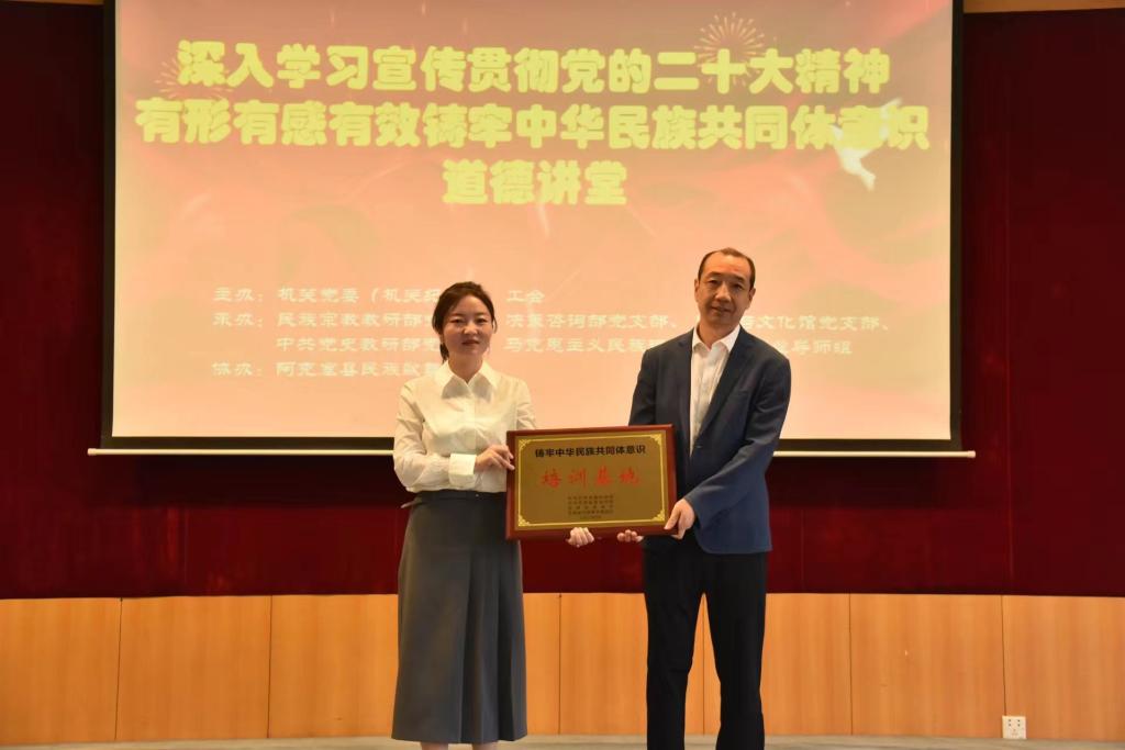 省民委党组成员、副主任王宇卫为中共甘肃省委党校(甘肃行政学院)民族宗教教研部颁发第二批《甘肃省铸牢中华民族共同体意识培训基地》牌匾。与会人员通过央视报道共同重温2022年中央统战工作会议精神,再次深刻领悟“两个确立”的决定性意义,和习近平总书记的谆谆教诲。