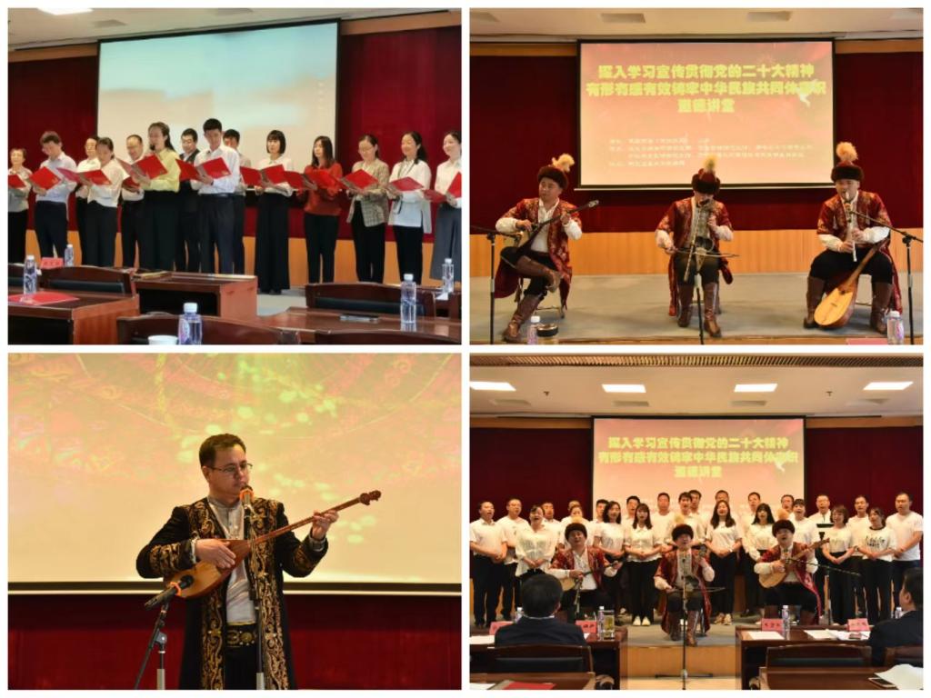 作为中华优秀传统文化代表国家级非物质文化遗产哈萨克冬布拉弹唱《牧羊马》《萨玛力山》、哈萨克民歌《别无爱戴》《金色的草原》等首次进“红色学府”展现了中华民族在长期的生产生活中像石榴籽一样紧紧抱在一起的生动局面,和相互依存、团结互助、相亲相爱的深厚情谊。击鼓传花趣味答题强化了对民族基本省情了解,诗朗诵《我爱你中国》表达了党校师生对祖国的深深挚爱一首感人至深的大合唱《在那遥远的地方》,婉转悠长的旋律穿越时空阻隔,将中华各族儿女的心紧紧连在了一起。
