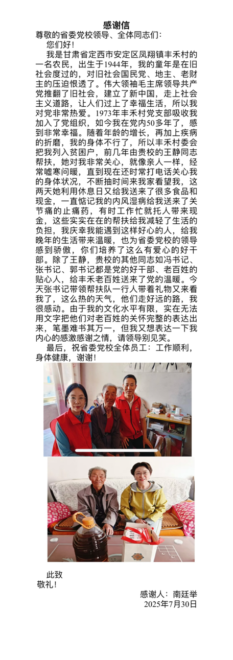 (通讯员 丹)近日,一封来自定西市安定区凤翔镇丰禾村的感谢信,跨越城乡距离,送到了省委党校(甘肃行政学院)帮扶办。信纸虽薄,却承载着81岁老党员南廷举对校(院)多年帮扶的滚烫真情;字迹质朴,却道尽了一位历经新旧社会变迁的老人对党的帮扶政策最真挚的认同。