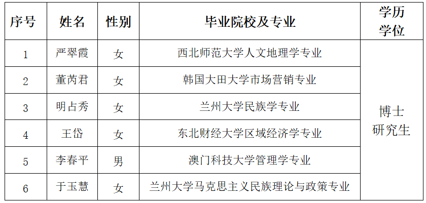 根据《中共甘肃省委党校(甘肃行政学院)公开招聘博士研究生公告》和事业单位公开招聘工作有关规定,通过报名、资格审查、考核、体检、考察等程序,经校(院)委会研究决定,现将最终确定的2022年度拟聘用的6名人员予以公示,接受社会监督。公示期间如有异议,可通过电话、来信如实反映,我们将认真核查,并将查核结果向实名反映情况者进行反馈。如不存在影响聘用的问题,将按规定程序办理聘用审批备案等手续。