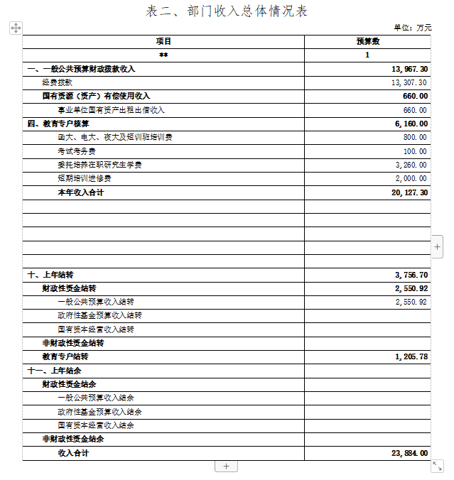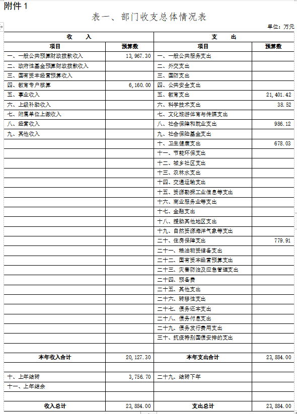 2024年部门收支总预算23,884.00万元。按照综合预算的原则,部门所有收入和支出均纳入部门预算管理。收入包括:一般公共预算拨款收入、教育专户收入、非财政性单位结转结余;支出包括:教育支出、科学技术支出、社会保障和就业支出、卫生健康支出、住房保障支出。