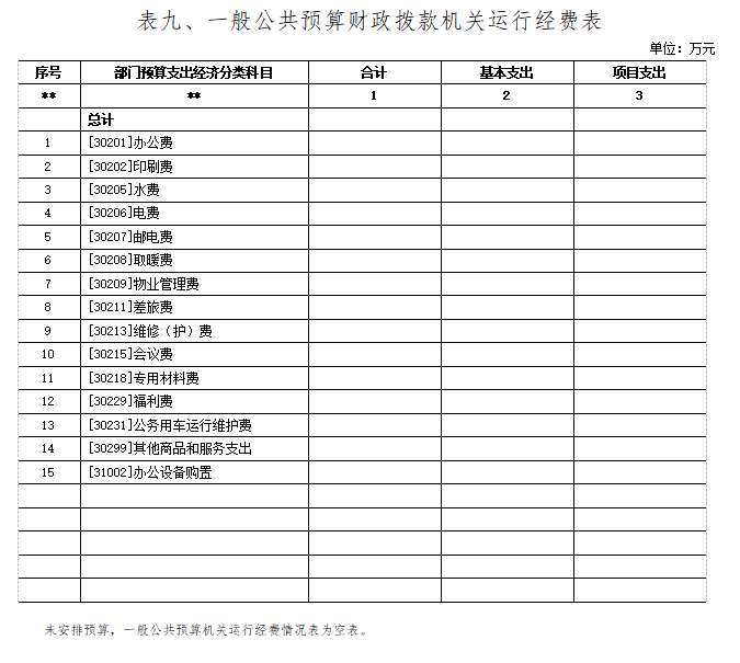 8、机关运行经费:为保障行政单位(包括实行公务员管理的事业单位)运行用于购买货物和服务的各项资金,包括办公及印刷费、邮电费、差旅费、会议费、福利费、日常维修费、一般设备购置费、办公用房水电费、办公用房取暖费、办公用房物业管理费、公务用车运行维护费以及其他费用。