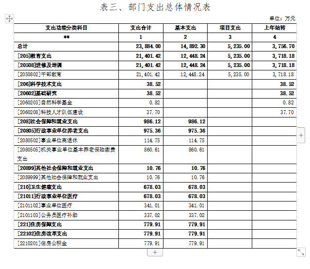 2024年支出预算23,884.00万元(详见部门预算公开表3)。其中:基本支出14,892.30万元,占62.35%;项目支出5,235.00万元,占21.92%;上年结转收入3,756.70万元,占15.73%。