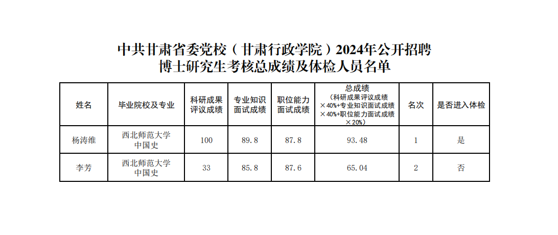 中共甘肃省委党校(甘肃行政学院)2024年公开招聘博士研究生考核工作已完成。现将参加考核人员的科研成果评议成绩、专业知识面试成绩职位能力面试成绩等情况予以公布,同时就体检事宜公告如下: