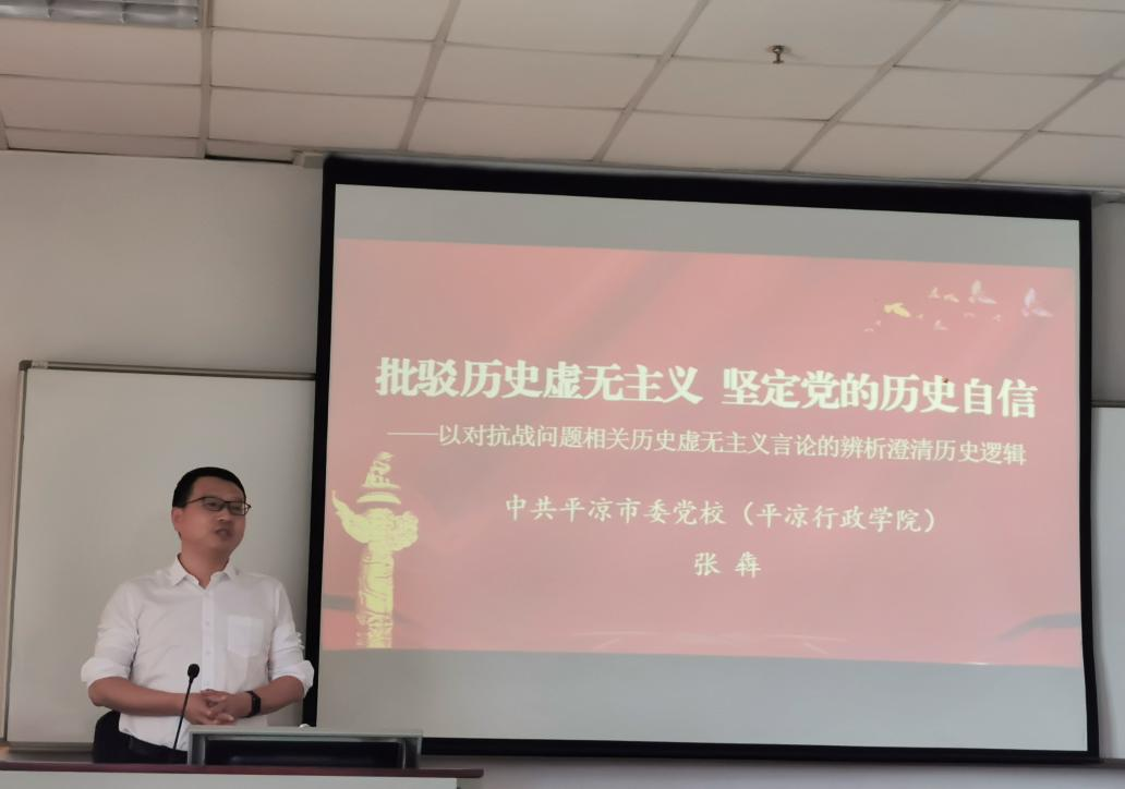第三组代表,来自中共平凉市委党校的张犇老师汇报了案例教学成果:《批驳历史虚无主义 坚定党的历史自信——以对抗日问题相关历史虚无主义言论的辨析澄清历史逻辑》