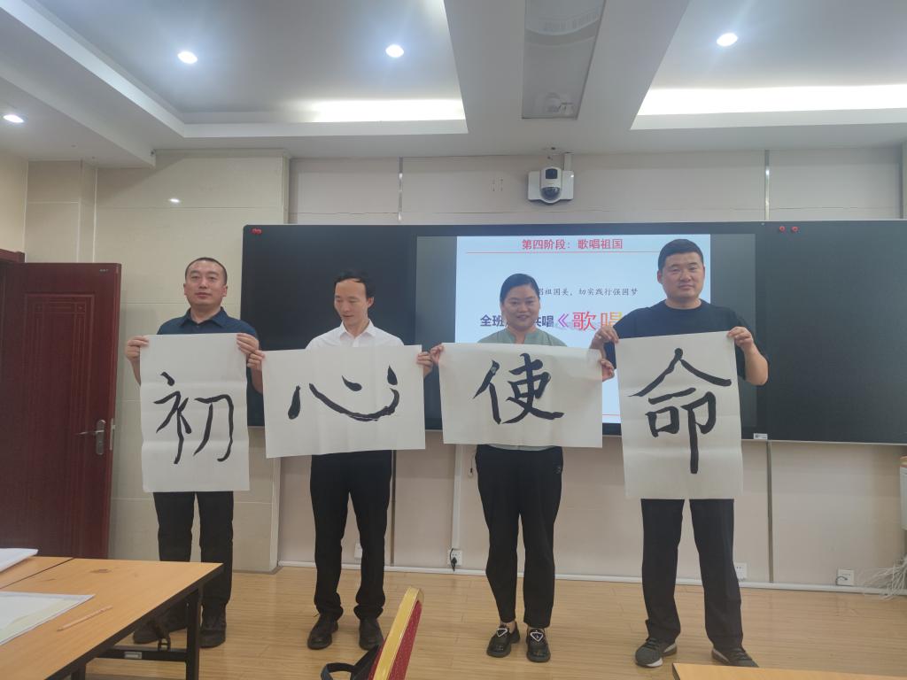 在共创辉煌环节,在学员们熟悉书写要领并做合理分工后,每位学员各拉一根系于毛笔上的绳子,心往一处想,劲往一处使,大笔挥洒写下“初心使命”四个大字,表现出全班学员不忘初心、牢记使命,踔厉奋发,勇毅前行的坚定信念。