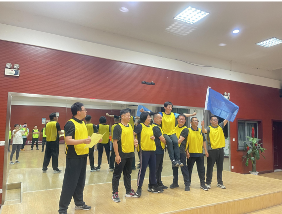 “组建团队 ”环节中,学员被随机分成三组,在各组队长的带领下,大家热烈讨论群策群力,短时间内共同设计了队徽、 队旗队歌、团队口号;在“ 团队展示 ”环节,学员们协作配合, 展示了创作成果,每个队演唱了队歌,充分展示了各自队伍的风 采,进一步发扬了团队精神,提高了凝聚力。