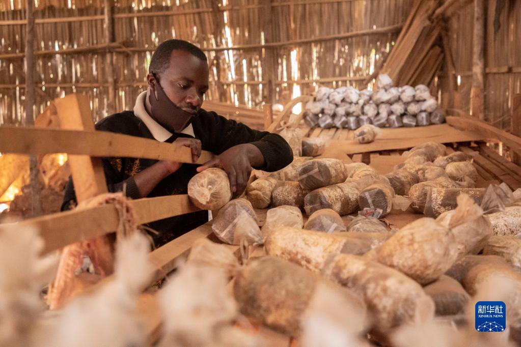 在卢旺达首都基加利的一家食用菌培育作坊,作坊主人埃马纽埃尔·阿希马纳检查菌袋(2020年9月9日摄)。中国福建农林大学的菌草专家2006年来到卢旺达开始菌草技术合作项目,在当地示范和推广菌草技术。新华社发(西里尔·恩德格亚摄)