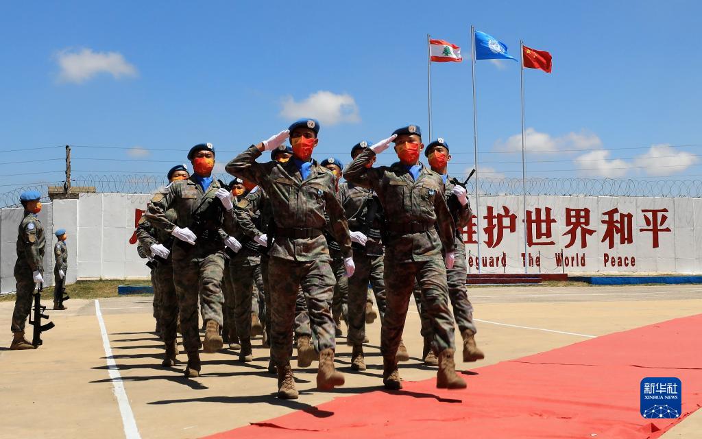 在黎巴嫩南部辛尼亚村的中国维和部队营区,中国维和部队官兵在受勋后通过观礼台(2022年7月1日摄)。新华社记者 刘宗亚 摄
